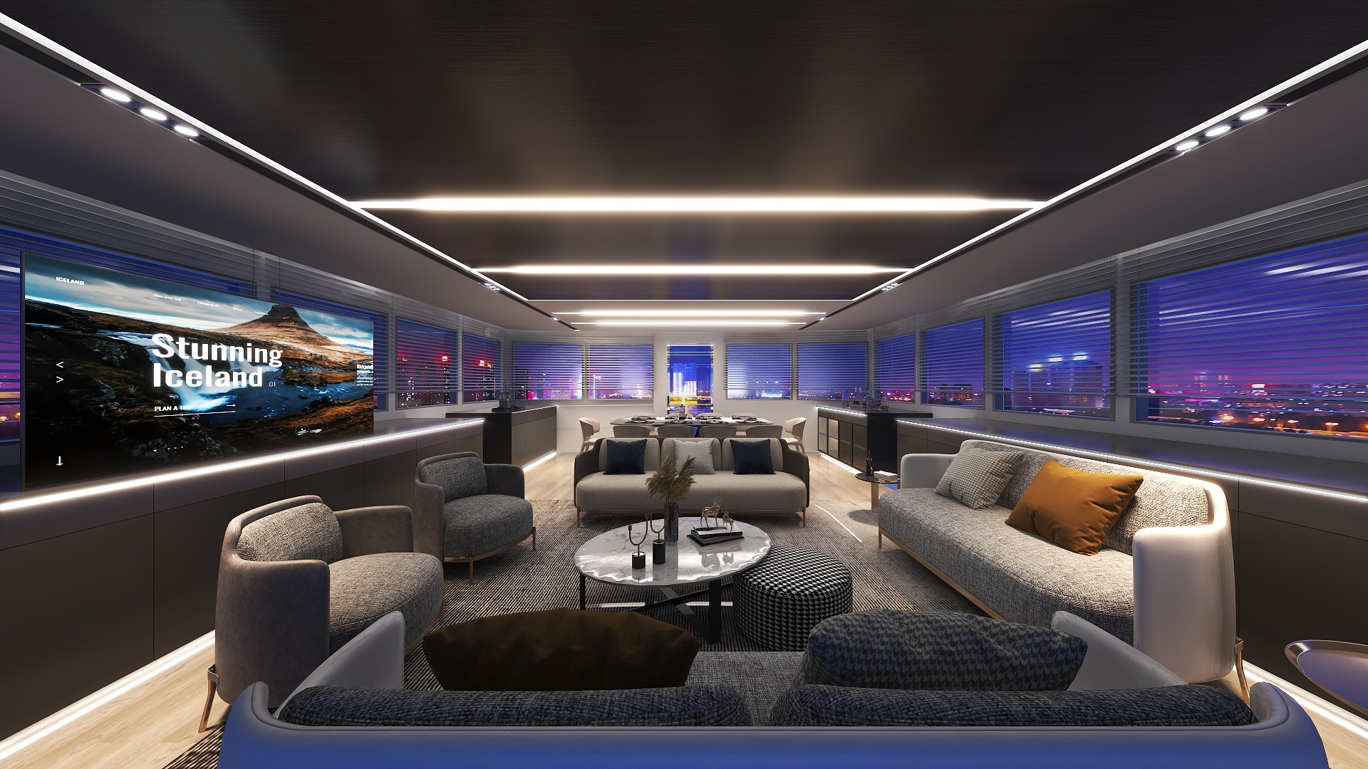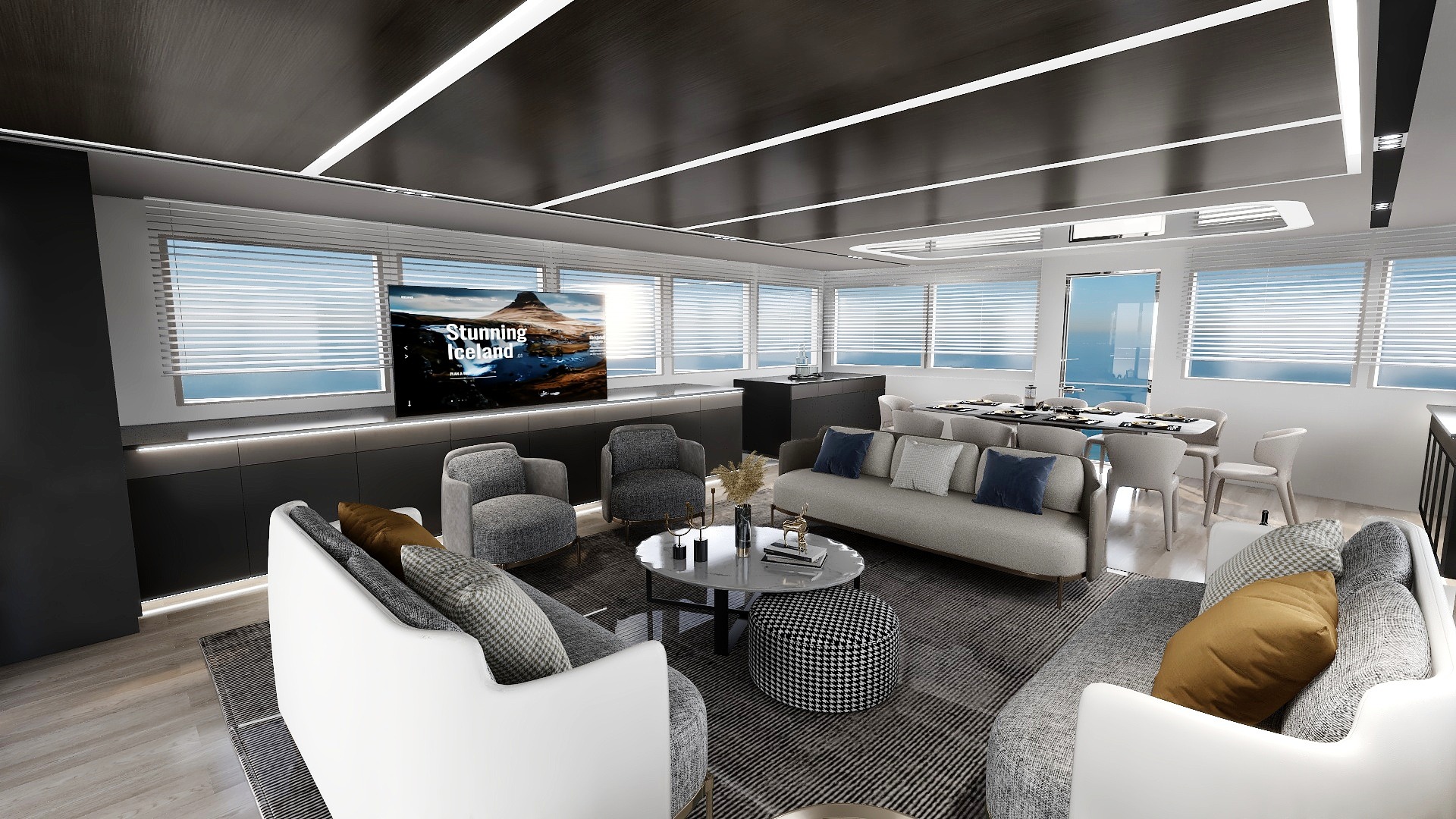 VIVIC VV58 Tamaran yacht, truly multi-function party yacht, function to meet the needs of Chinese boat, stern trap set with open BBQ, the bridge hardtop round table, in line with the dining habits, the bridge stern set comfortable outdoor sofa, can sit or lie; the stern set with hydraulic lifting platform, loading a sports motorboat or attached boat. VV 58 is positioned as a luxury business reception catamaran yacht with large space. The whole ship is divided into multiple functional sections. The stern trap, salon, bow and flying bridge are all equipped with a comfortable space suitable for reception reception.